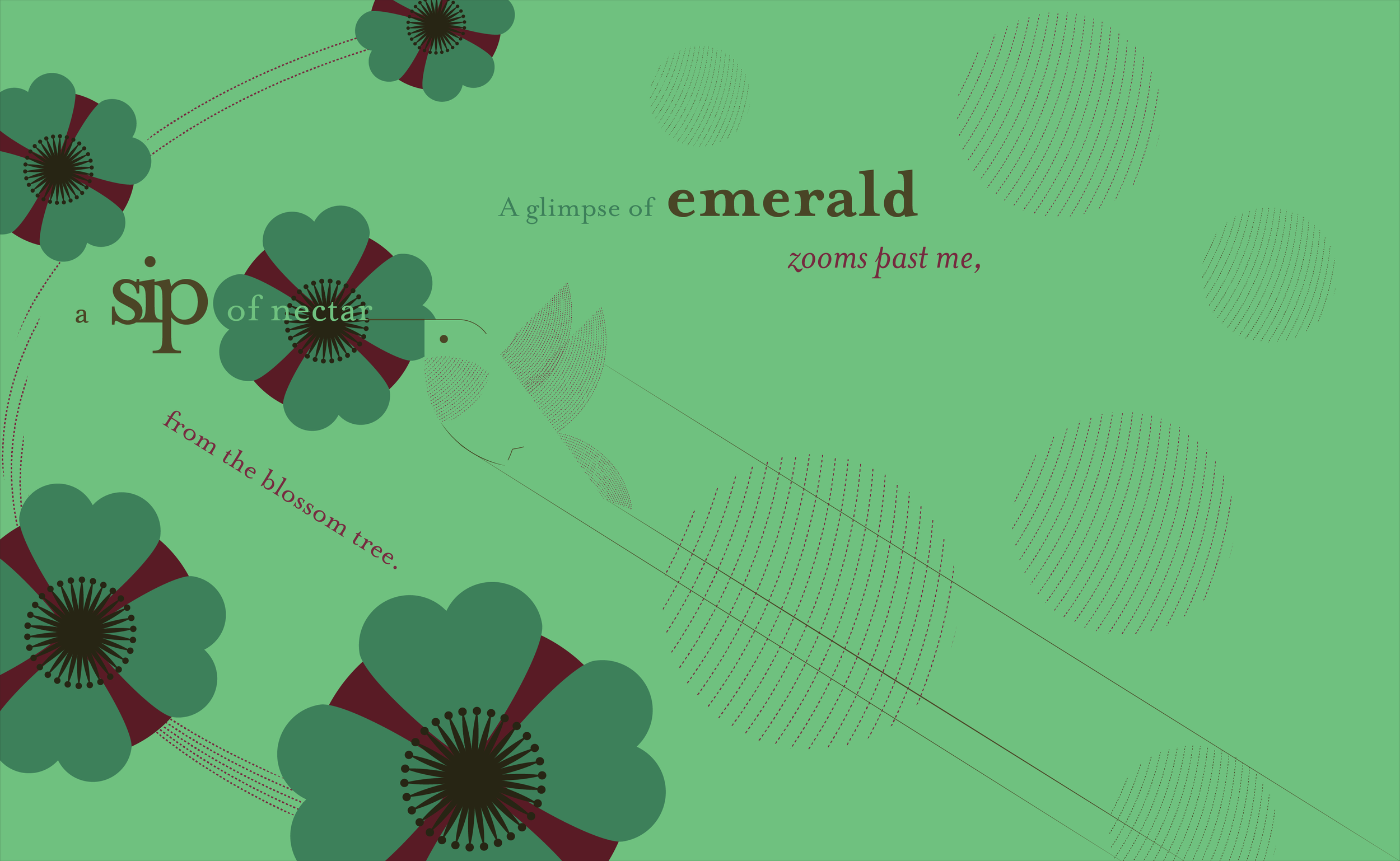 “A glimpse of emerald zooms past me, a sip of nectar from the blossom tree.”